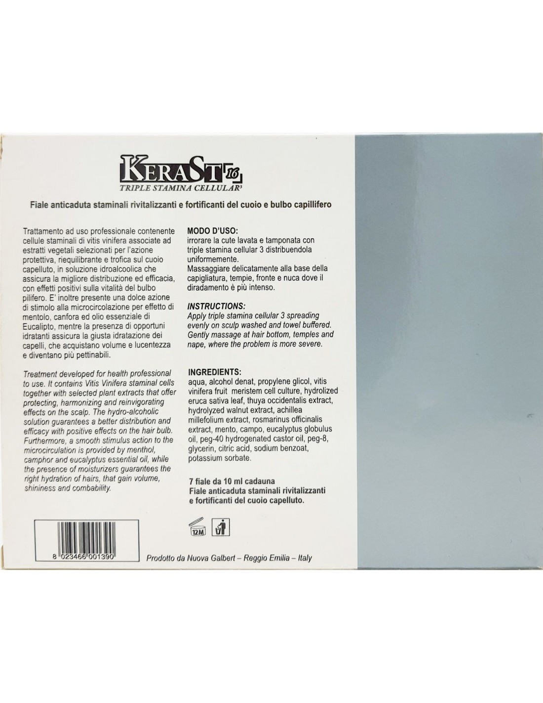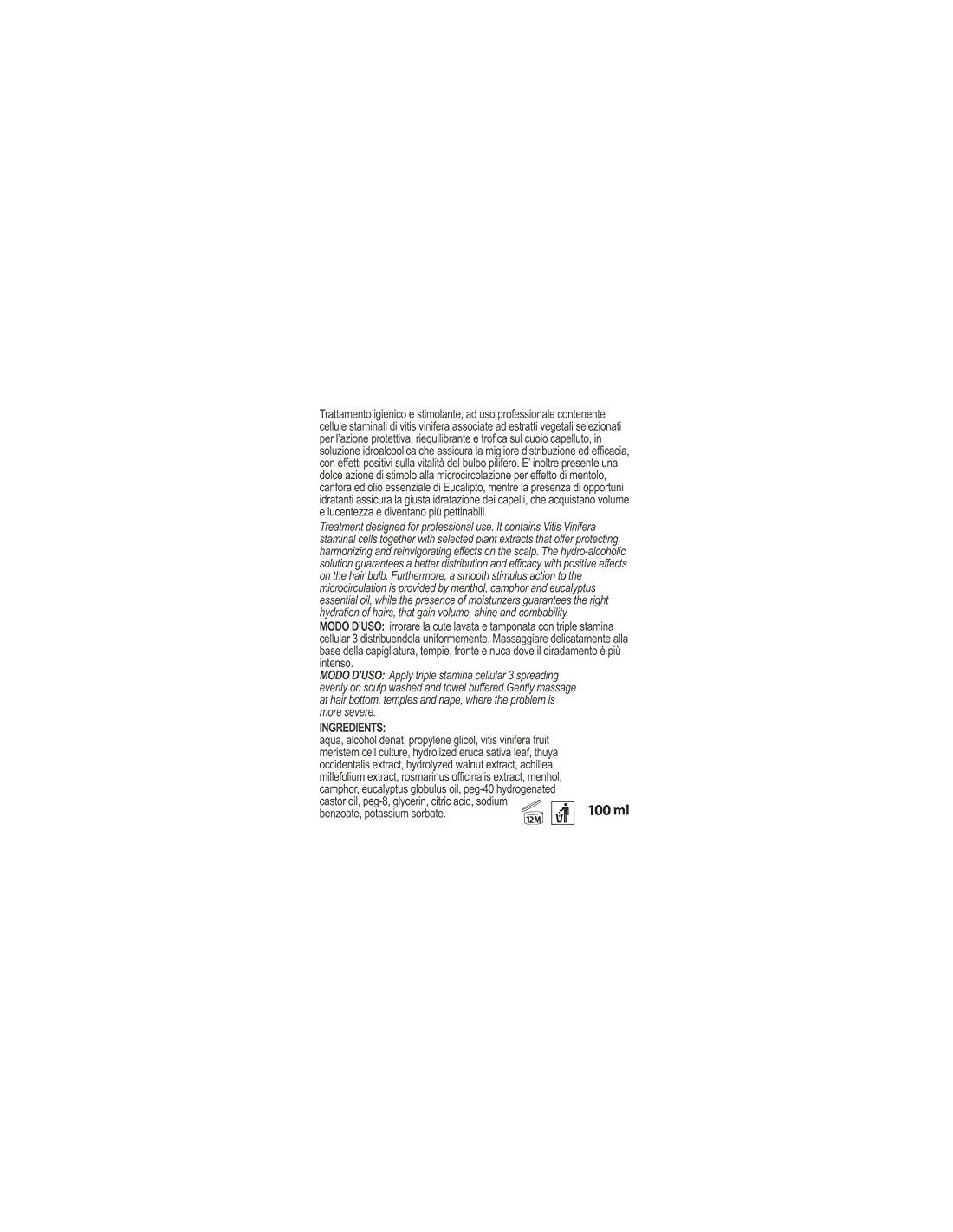 Trattamento ad uso professionale contenente cellule staminali di vitis vinifera associate ad estratti vegetali selezionati per l’azione protettiva, riequilibrante e trofica sul cuoio capelluto, in soluzione idroalcoolica che assicura la migliore distribuzione ed efficacia, con effetti positivi sulla vitalità dei bulbo pilifero.