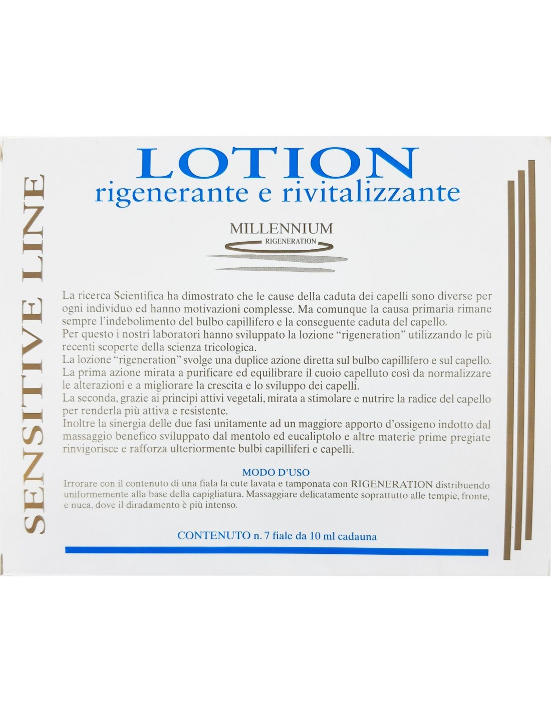 MODO D’USO: Irrorare la cute lavata e tamponata con RIGENERATOR distribuiendola uniformamente alla base della capigliatura. Massaggiare delicatamente sopratutto alle tempie, fronte e nuca dove il diradamento è più intenso.