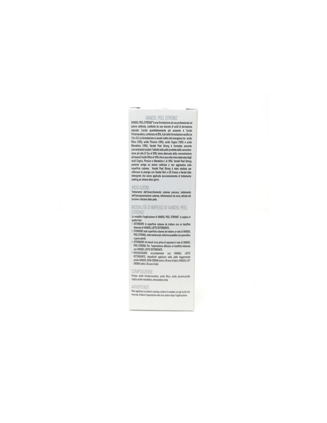 VANDEL PEEL STRONG è un peeling adatto al trattamento delle cheratosi e pelli invecchiate, affette da iperpigmentazione ed esiti cicatriziali. E’ indicato per prevenire i segni dell’invecchiamento cutaneo e favorire il turnover cellulare. Vandel peel strong si è rivelato inoltre molto efficace nel trattamento dell’infiammazione acneica.