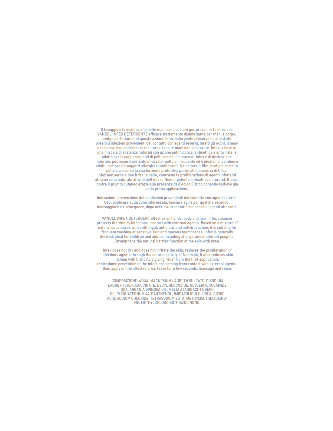 Il lavaggio e la disinfezione delle mani sono decisivi per prevenire le infezioni. VANDEL INFEX DETERGENTE efficace trattamento disinfettante per mani e corpo, svolge perfettamente questa azione.
